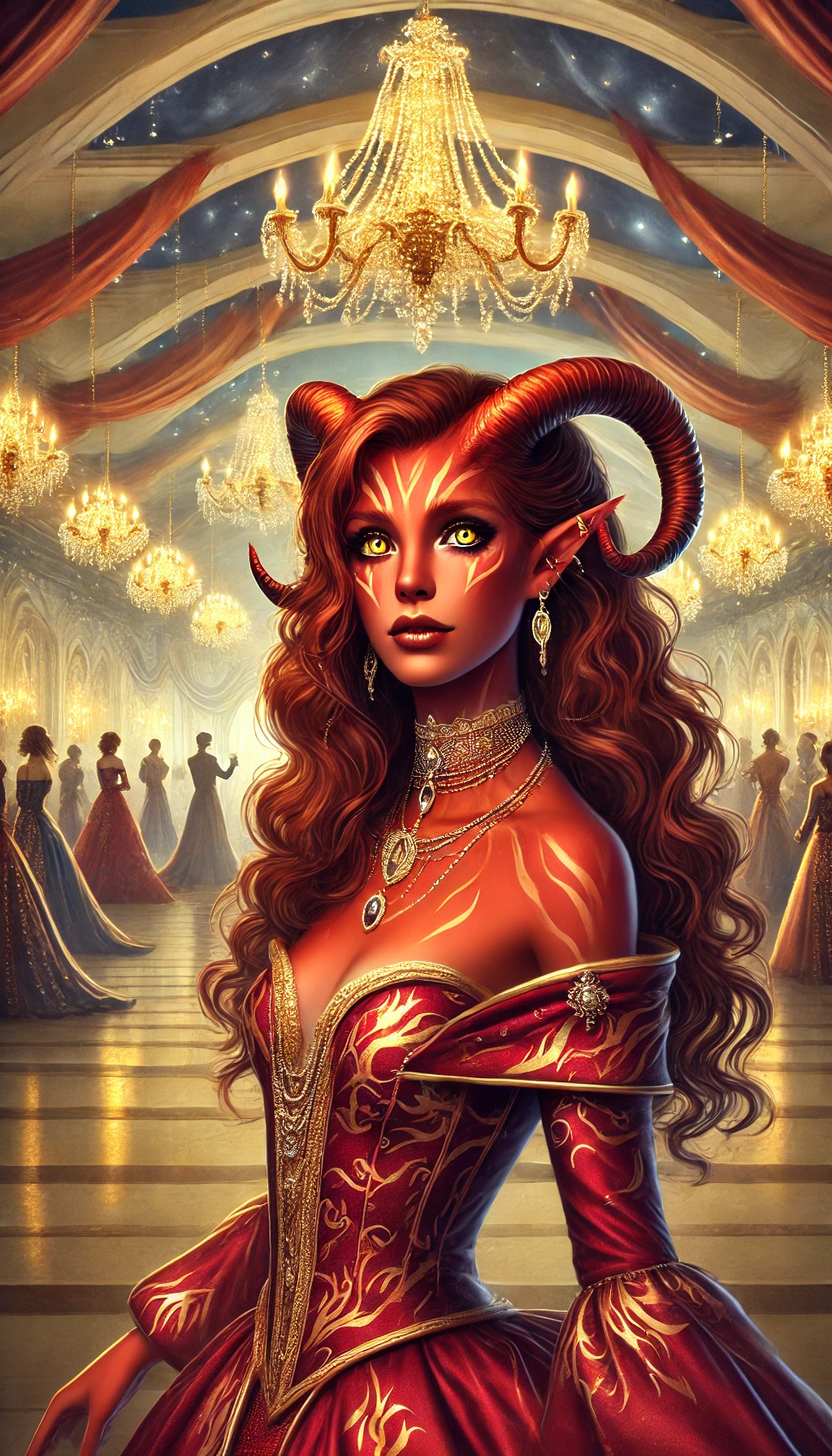 Clothing: Fitted silk dresses in crimson and gold, trimmed with arcane symbols and fireproof enchantments. Often accessorised with ruby-studded jewellery.